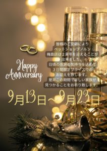 株式会社Precious One創業2周年‼ お客様のご愛顧により無事、3年目を 迎えることが出来ました。この感謝の気持ちを お客様にお伝えすべく 全頭3万円引きのセールを実施します。 この夏も、皆さまの幸せのお手伝いが […]