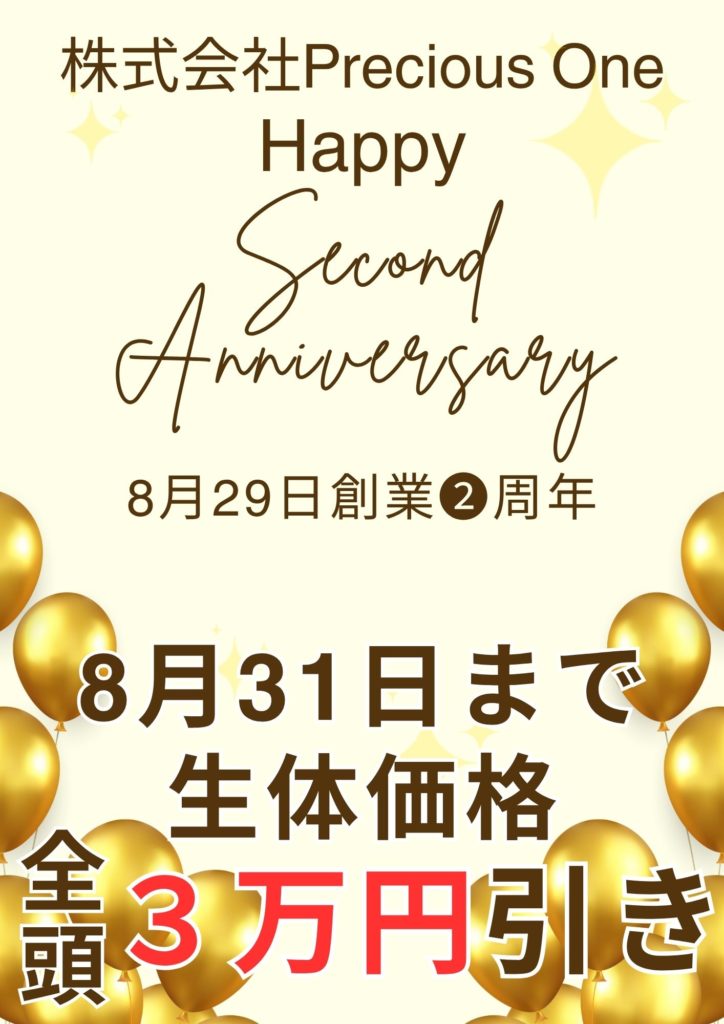 ㈱Precious One創業2周年!全頭3万円引きセール開催!!